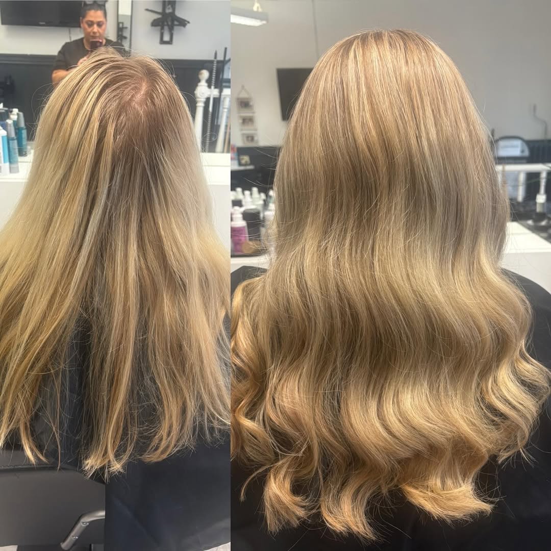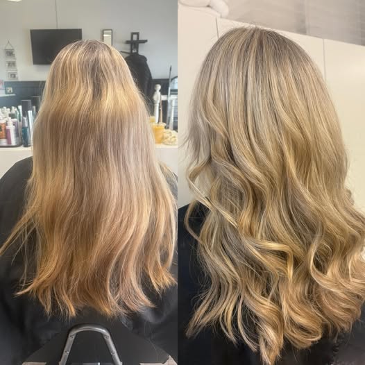 Därefter följer folieslingor, där vi applicerar slingorna för att skapa dimension och lyster i ditt hår. Vi arbetar med precision för att ge dig ett naturligt och strålande resultat.