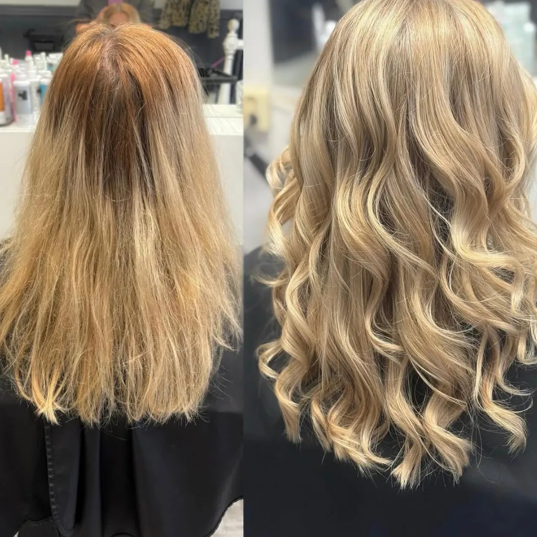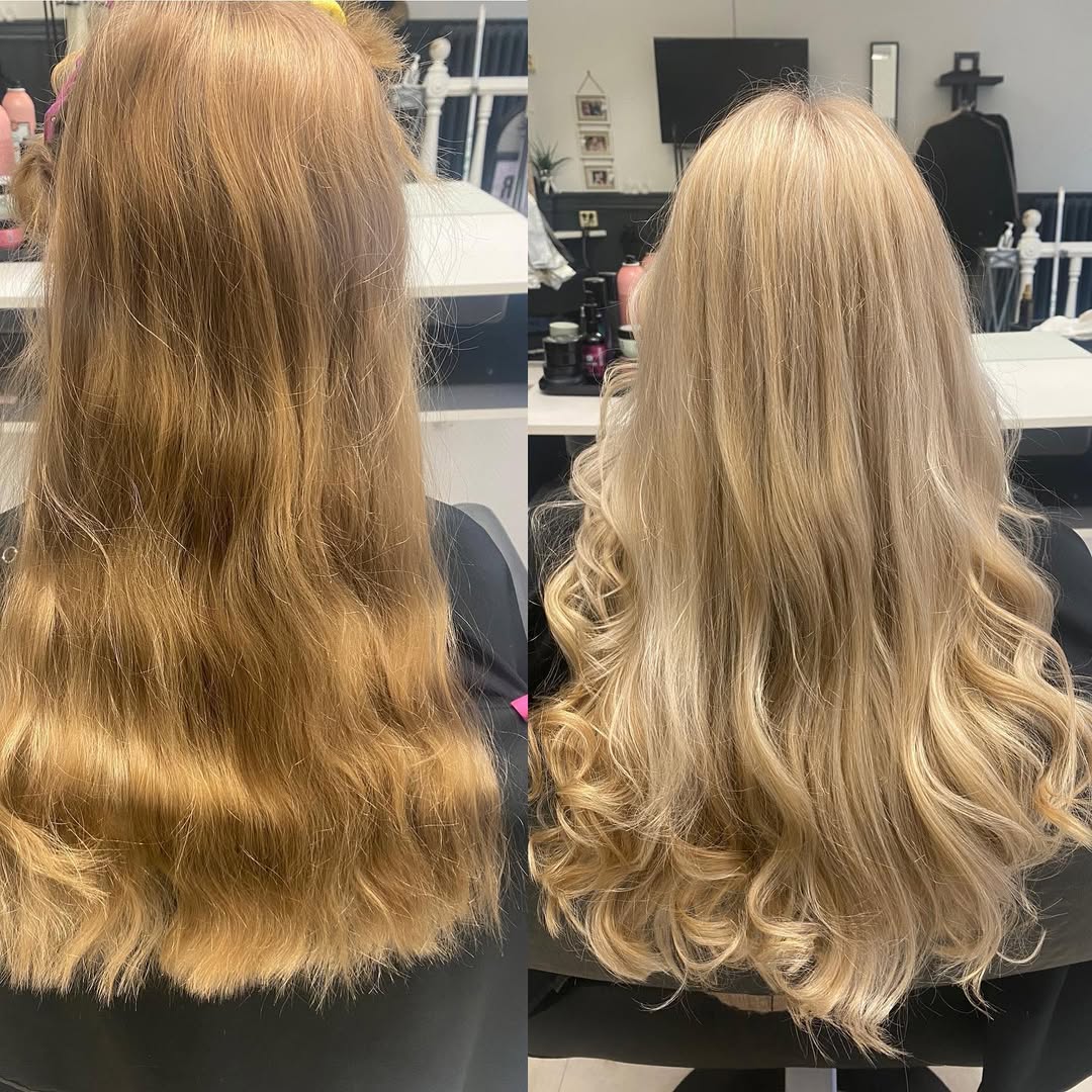 När håret är rent, går vi vidare till att nyansera slingorna. Detta steg hjälper till att neutralisera oönskade toner och framhäva de nyanser som passar just dig. Sedan torkar vi ditt hår försiktigt för att förbereda det inför nästa steg i behandlingen.